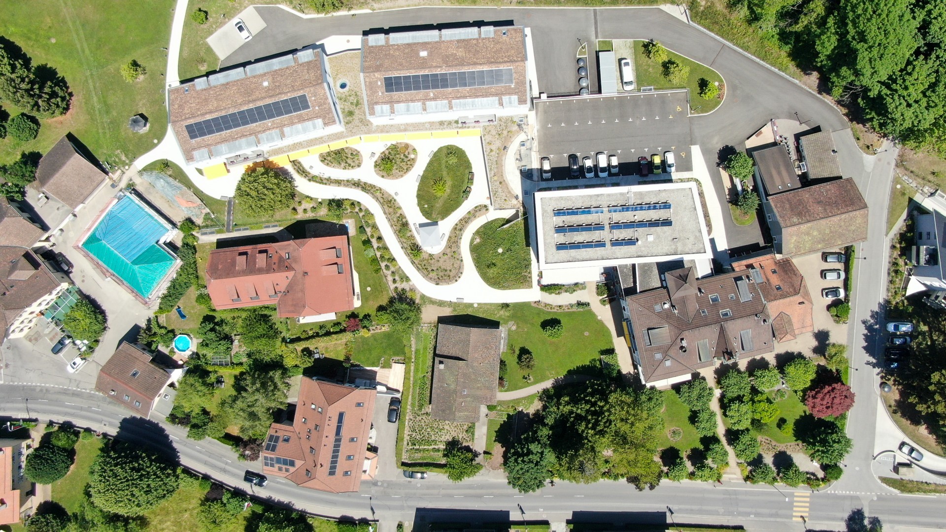Le projet consiste en un volume compact implanté à la place de l’ancienne villa entre les jardins de l’EMS et la Route des deux villages. Le projet répond au gabarit volumétrique inscrit dans le PPA et cherche à utiliser la surface à disposition d’une manière efficace. Le programme consiste en 20 logements avec un mix de 2.5 et 3.5pces organisés autour d’une cage verticale et distribués à travers les 5 étages. Le centre médical se situe au rez-de-chaussée sur un demi-sous-sol se composant de caves, abri PC et services techniques. Les logements protégés profiteront des synergies de l’EMS du Home Salem. Les résidents sont encouragés à participer à la vie de l’EMS et du centre d’accueil temporaire où se situent les cafés et les salles d’animations de l’institution. La surface médicale est à disposition des résidents de l’EMS qui profitent ainsi d’une présence médicale immédiate et sur place. Le projet respecte les normes pour les logements adaptés aux usagers handicapés afin de pouvoir accueillir le plus grand nombre de résidents. Le projet sera labellisé Minergie P. avec une production de chauffage sur site par une chaudière à pellets et des panneaux photovoltaïques pour l’autoconsommation.
