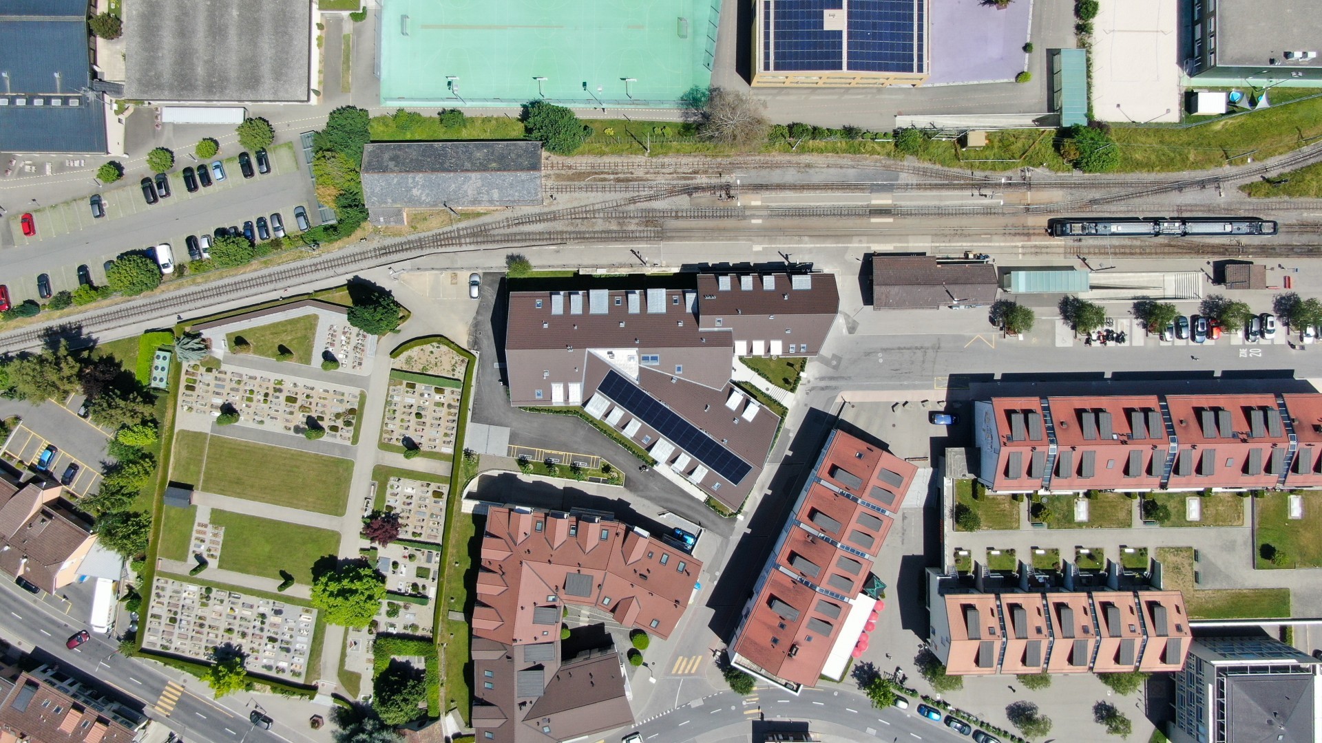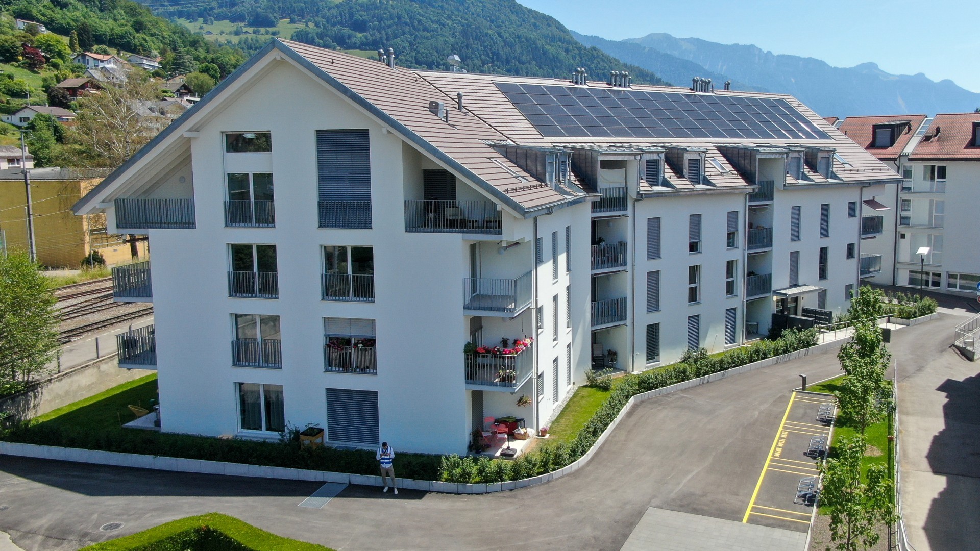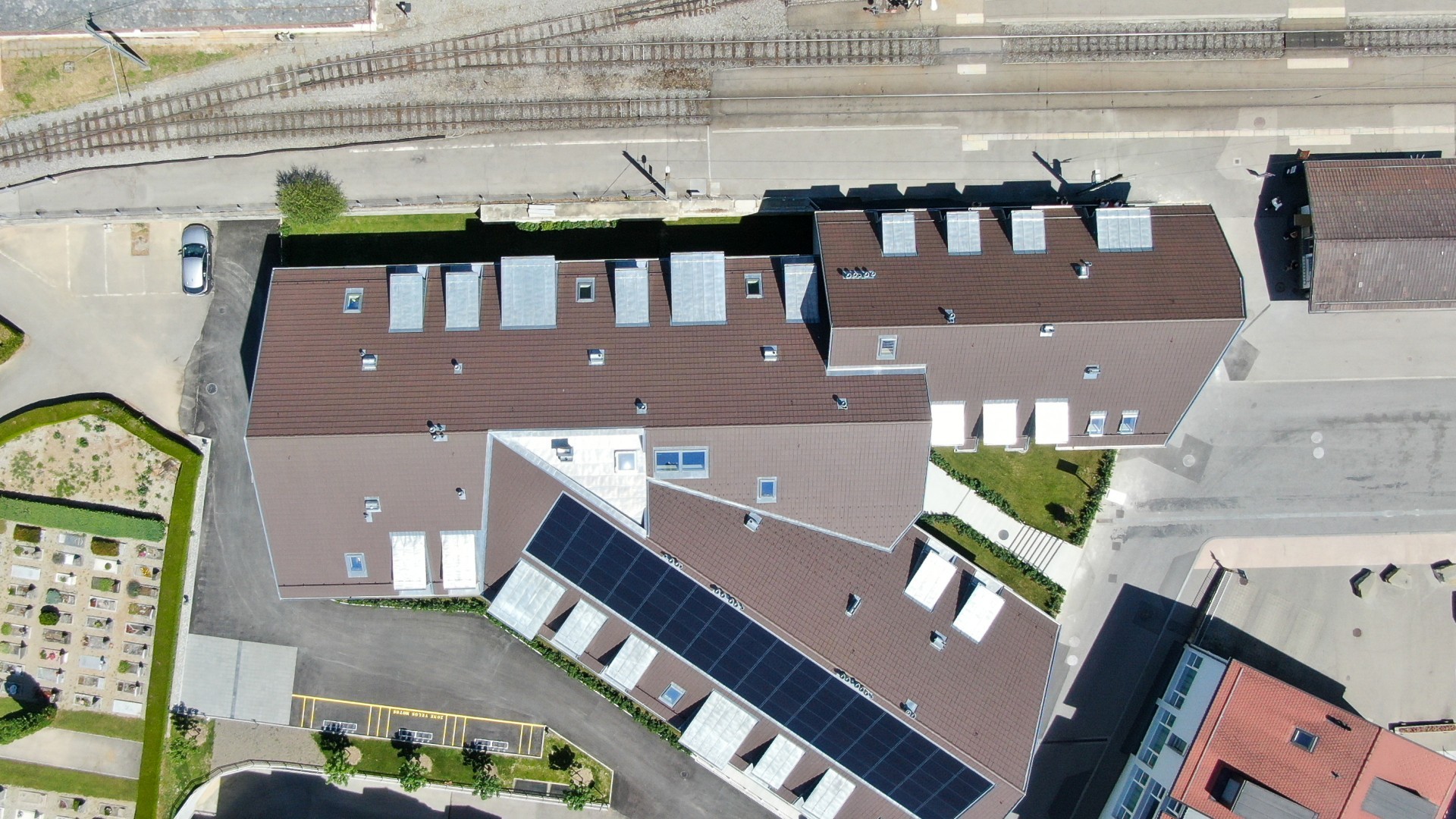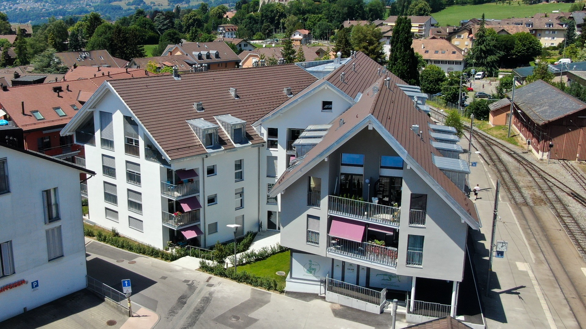 Livré en 2022, le bâtiment se compose de 41 logements de 2, 3 et 4 pièces, un local communautaire dédié aux logements protégés et l’encadrement social. La construction a été réalisée en traditionnelle en corps d’état séparé sous la direction de l’architecte avec des entrepreneurs locaux et aux standards Minergie. La structure porteuse est en béton armé et l’isolation périphérique en crépi est réalisée avec une laine minérale. La production de chauffage se fait via le chauffage à distance de la commune, BloCad, assuré par l’exploitant Groupe E. Des panneaux photovoltaïques en toiture viennent compléter l’apport énergétique en autoconsommation. Tous les logements protégés de la Résidence du Centre offrent une architecture appropriée, pleinement conforme aux normes définies par l’Etat de Vaud et aux prescriptions en vigueur (norme SIA 500 : Constructions sans obstacles). Le bâtiment totalise 3’760m2 habitables ceci pour un volume SIA d’environ 15’600m3.