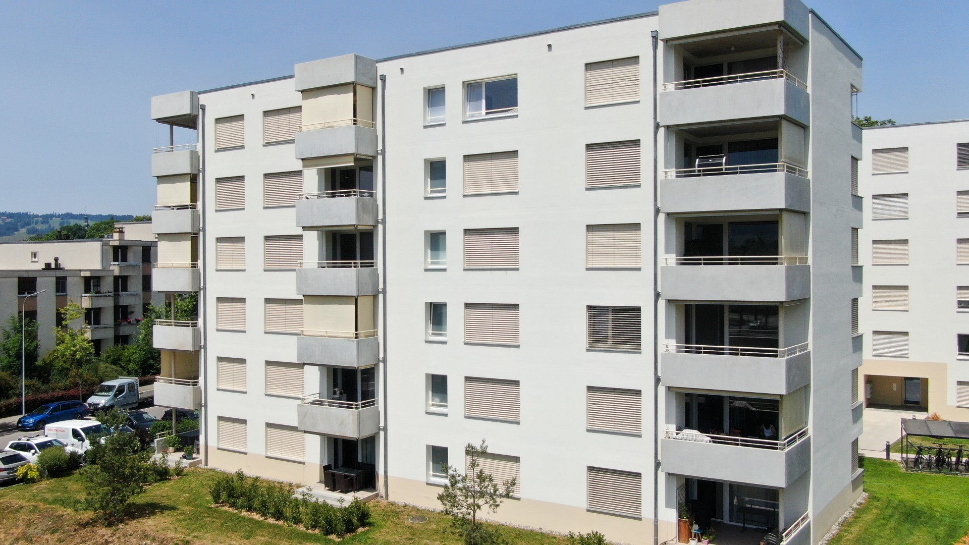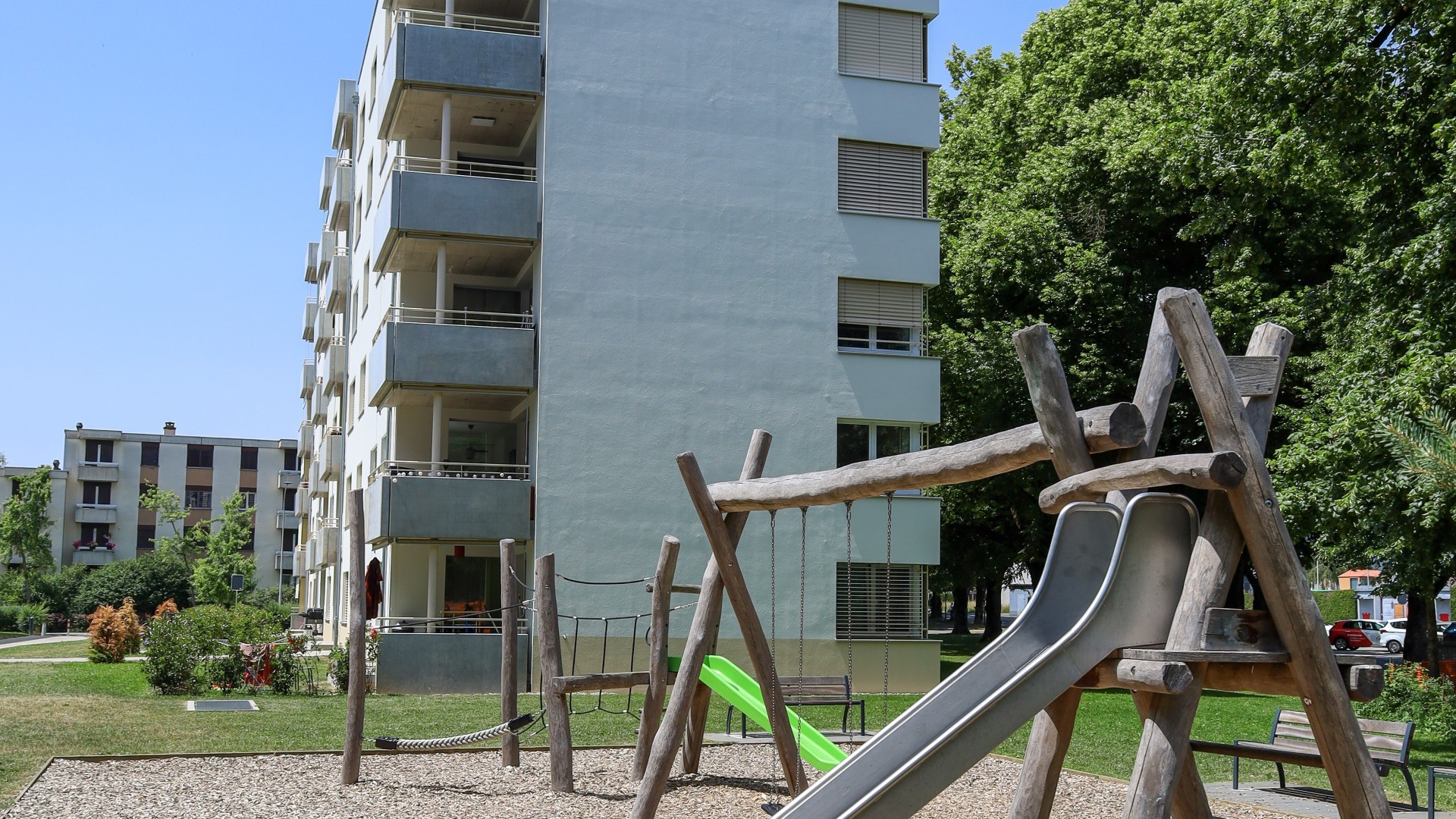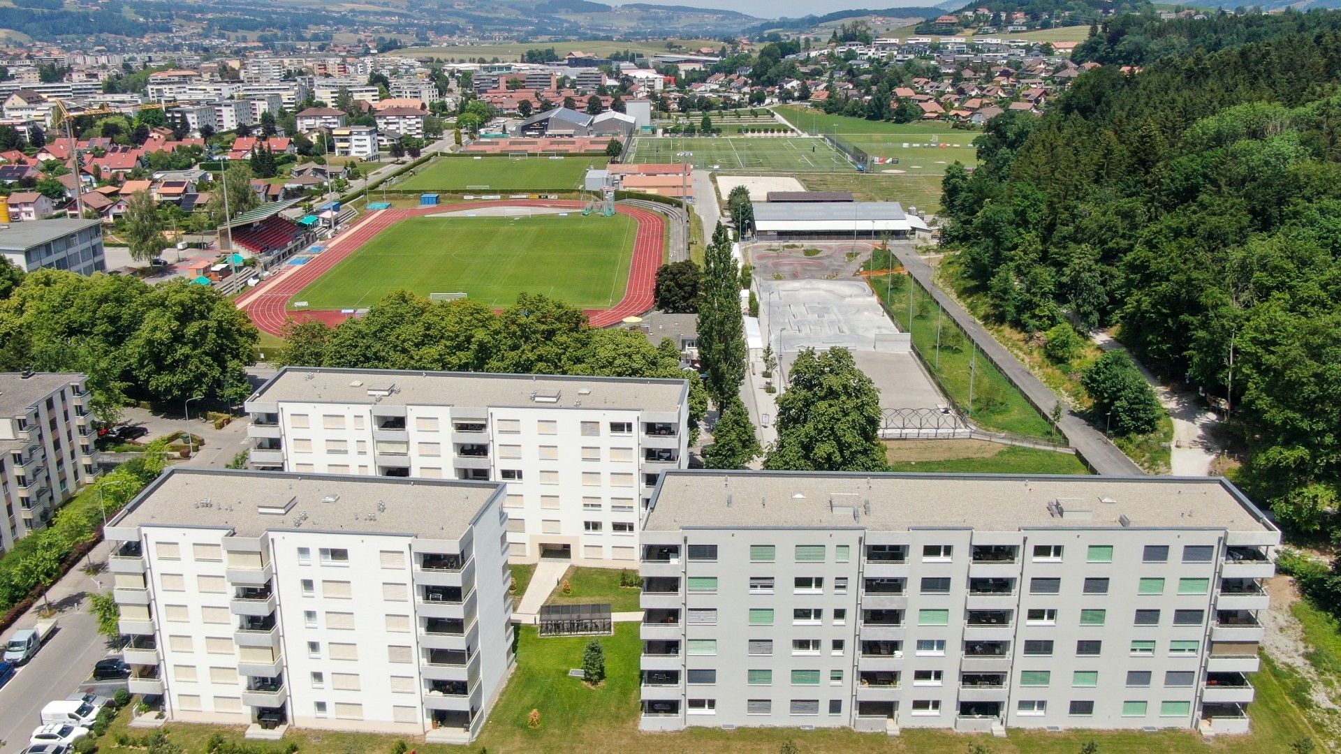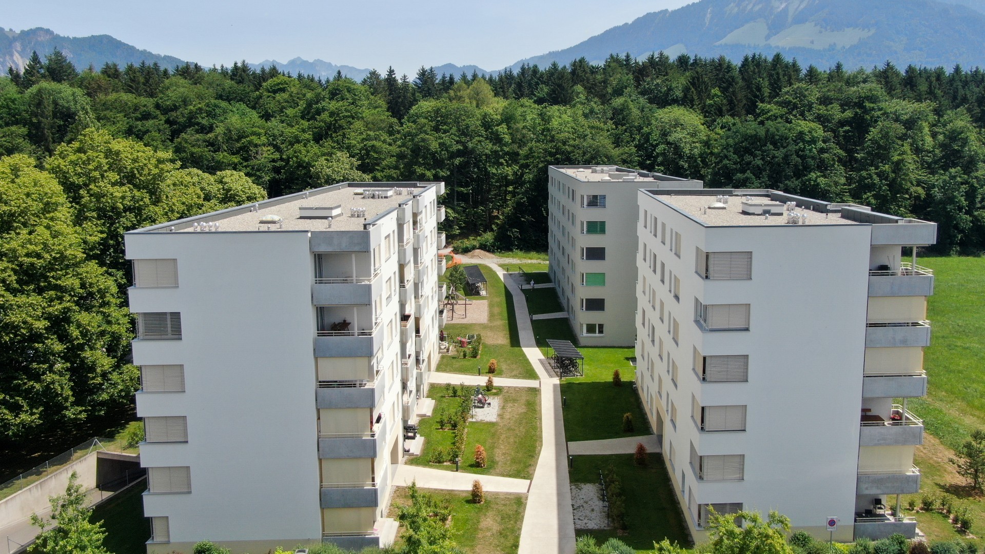 Les trois immeubles sont agencés de manière à profiter de l’orientation sud et de la vue imprenable sur le Moléson. Les appartements traversants disposent de généreuses loggias ouvertes sur la forêt et le grand paysage. Le parking souterrain, commun aux trois immeubles, dispose de 77 places de parc.