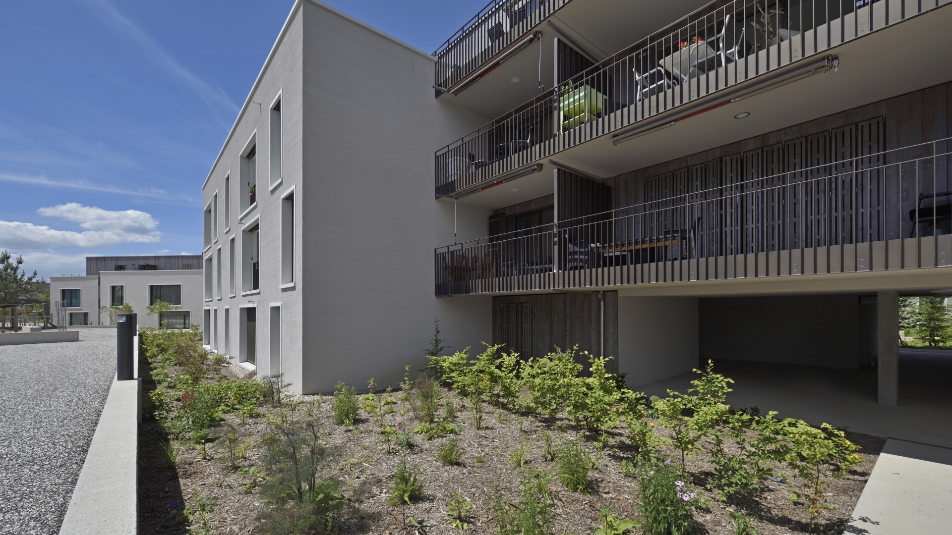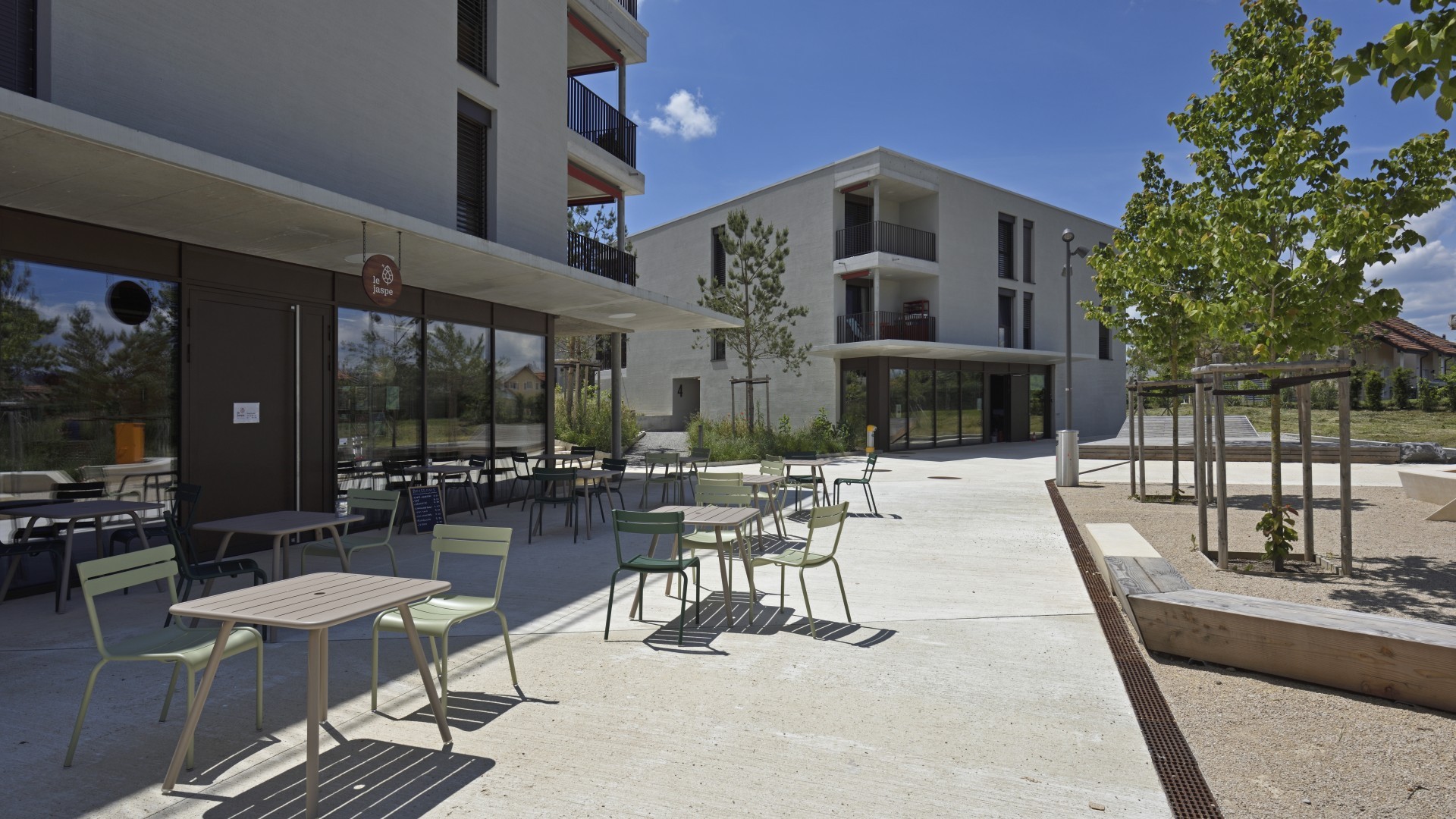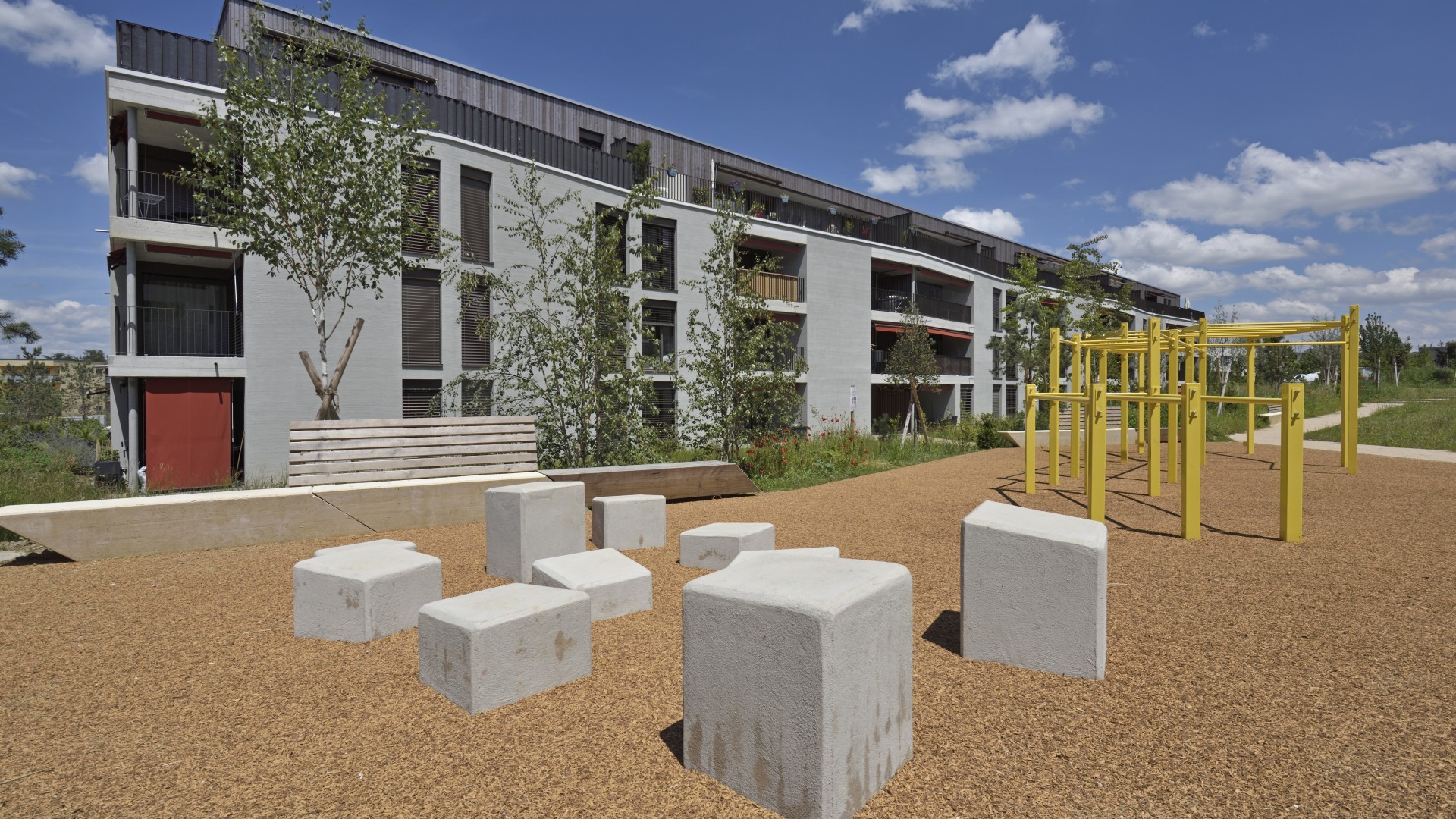 Realitim réalise 44 lots en PPE sur 4 immeubles au Nord-Ouest (22) et au Sud-Ouest (22) du quartier. Parmi les lots à la vente, un lot commercial est situé à l’entrée du quartier au nord, permettant aux habitant d’accéder à un potentiel commerce ou service. Ces logements s’adressent à tout type de clientèle : les familles ayant besoin d’espace, les jeunes pour qui les transports fréquents à proximité sont indispensables, mais aussi aux personnes plus âgées souhaitant profiter d’un lieu calme et reposant. Chaque logement dispose également d’une ouverture vers l’extérieur avec une loggia, une terrasse ou un jardin selon les lots.