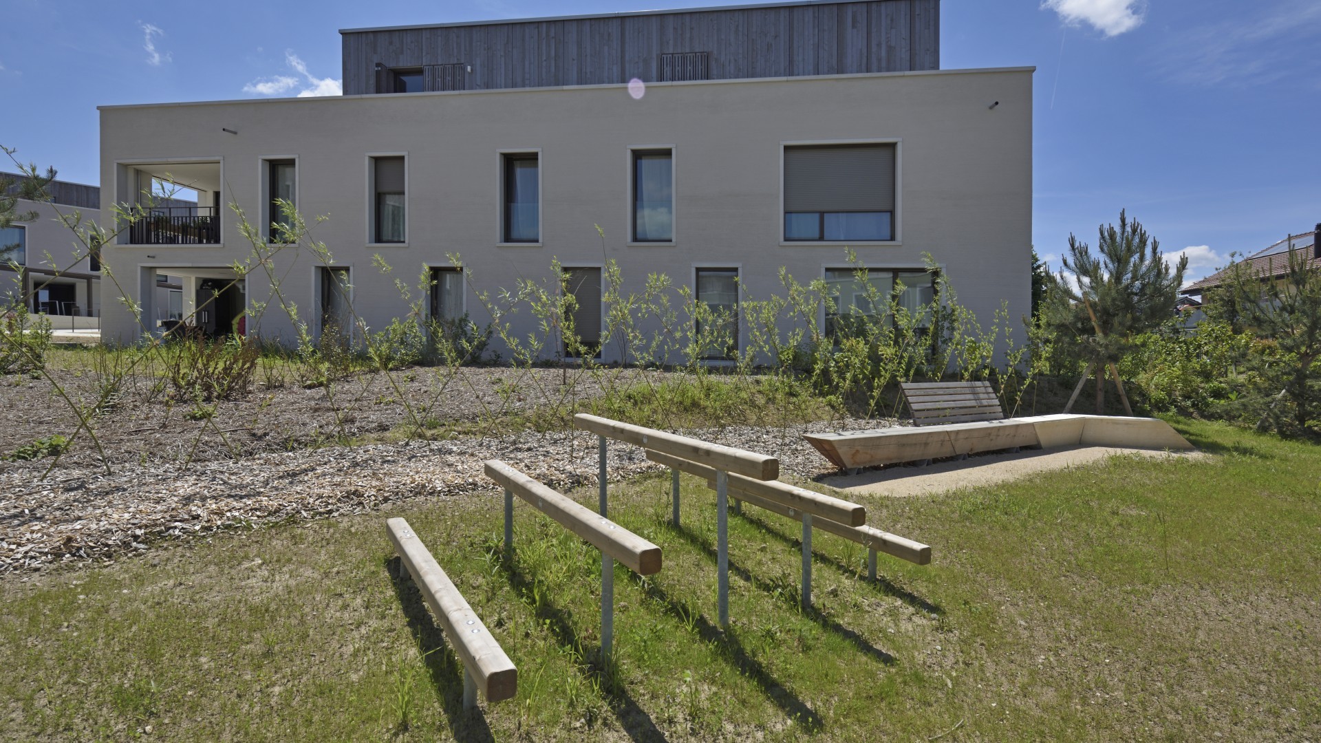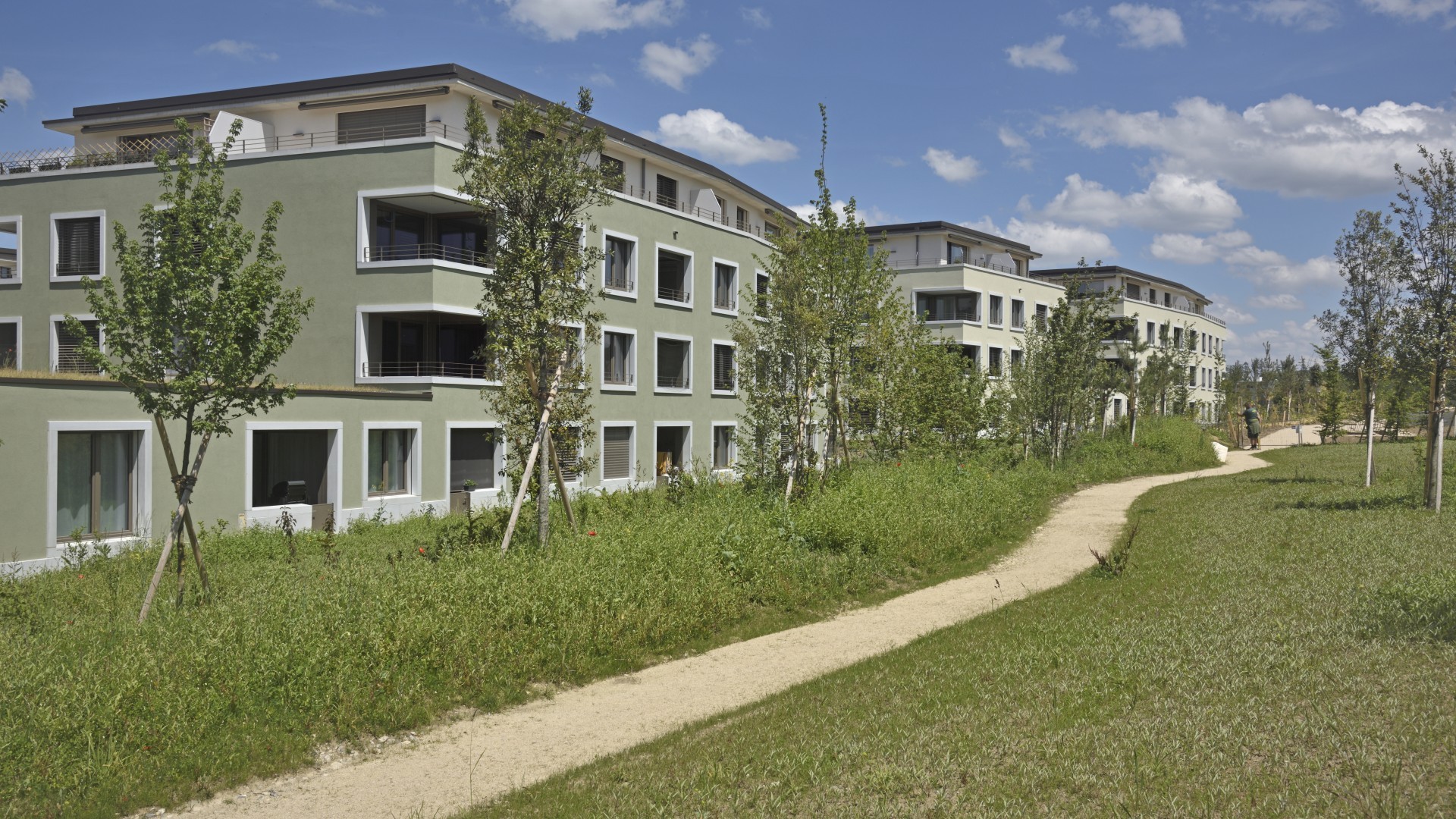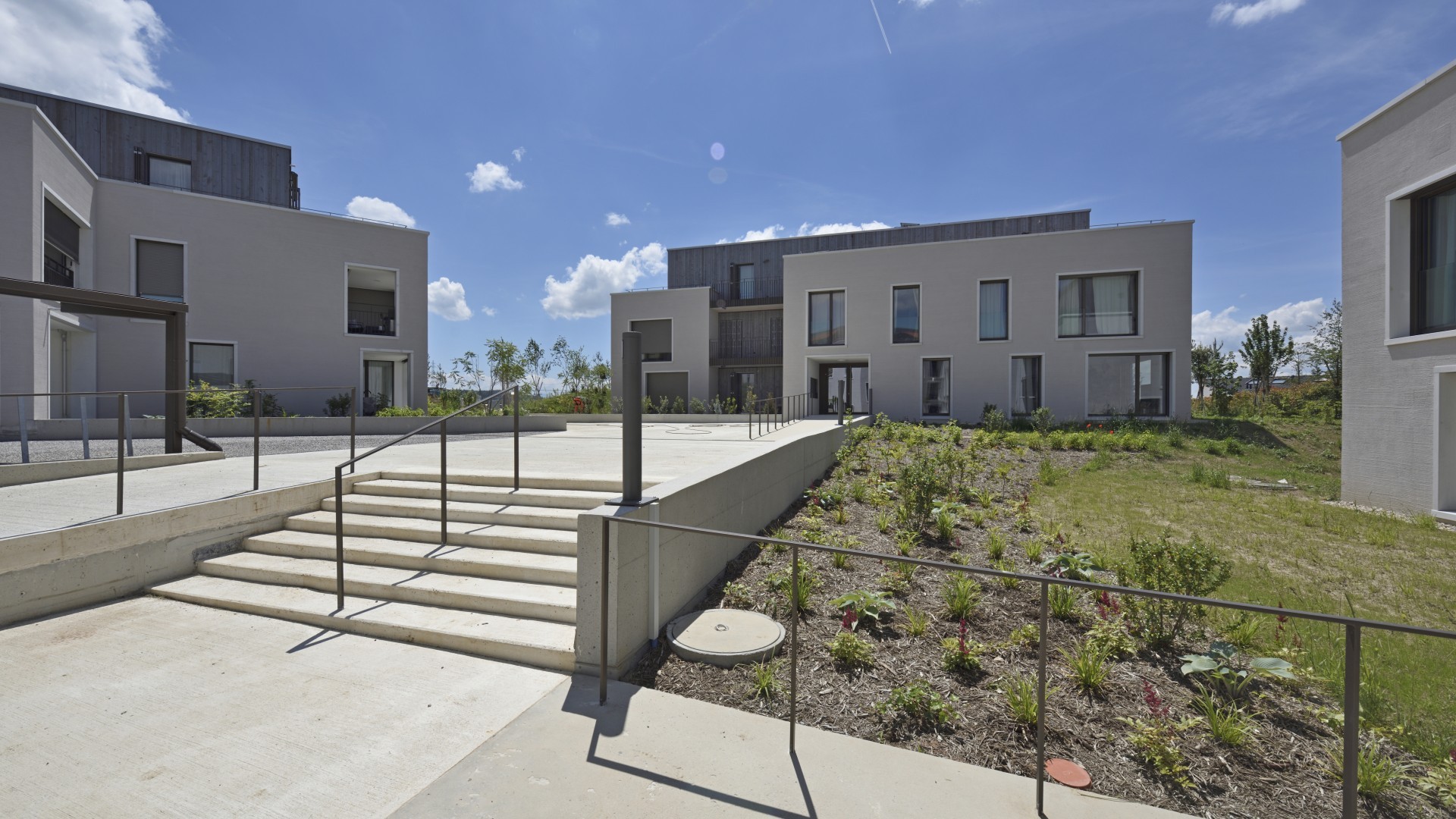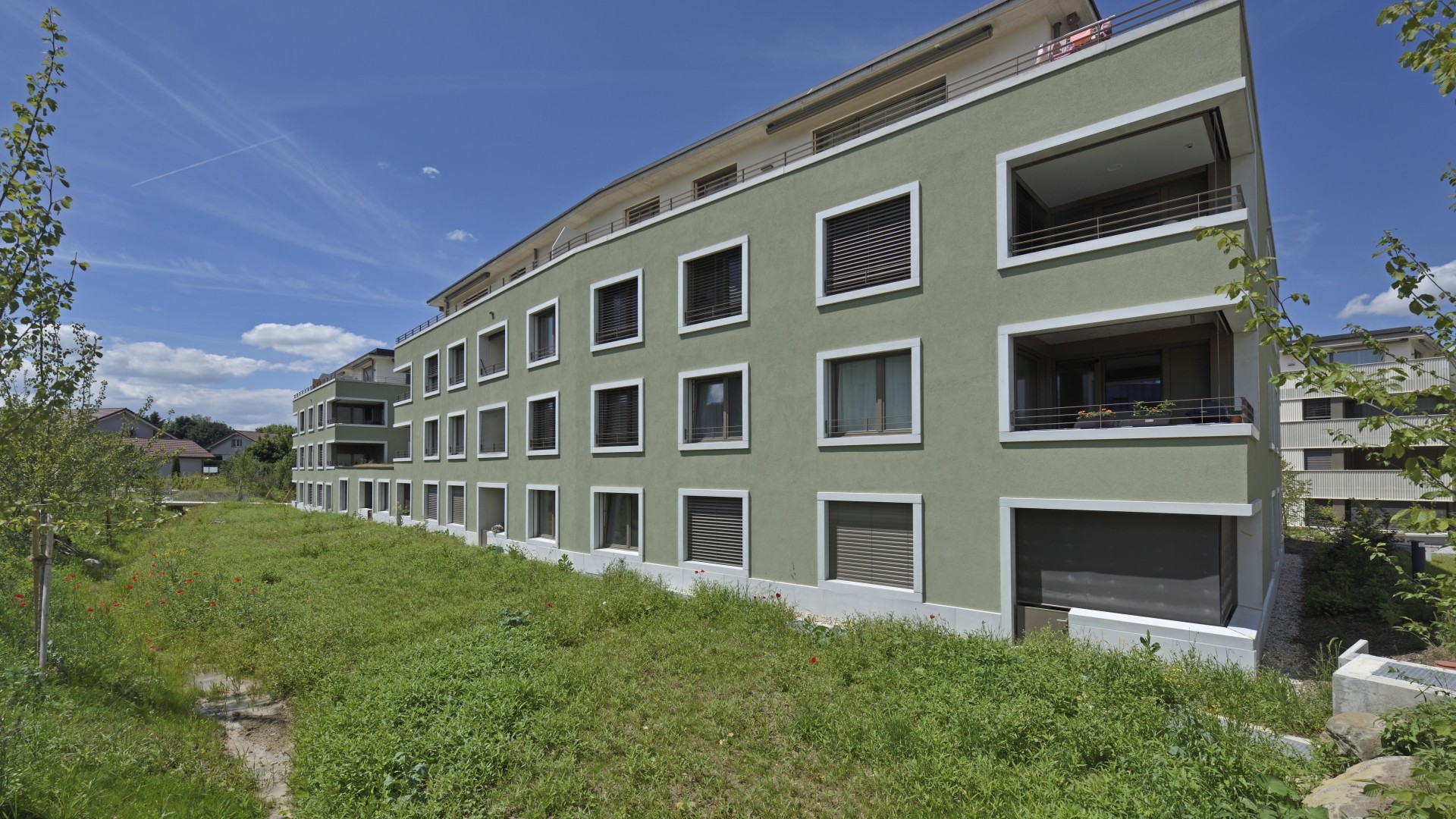 Realitim réalise 44 lots en PPE sur 4 immeubles au Nord-Ouest (22) et au Sud-Ouest (22) du quartier. Parmi les lots à la vente, un lot commercial est situé à l’entrée du quartier au nord, permettant aux habitant d’accéder à un potentiel commerce ou service. Ces logements s’adressent à tout type de clientèle : les familles ayant besoin d’espace, les jeunes pour qui les transports fréquents à proximité sont indispensables, mais aussi aux personnes plus âgées souhaitant profiter d’un lieu calme et reposant. Chaque logement dispose également d’une ouverture vers l’extérieur avec une loggia, une terrasse ou un jardin selon les lots.