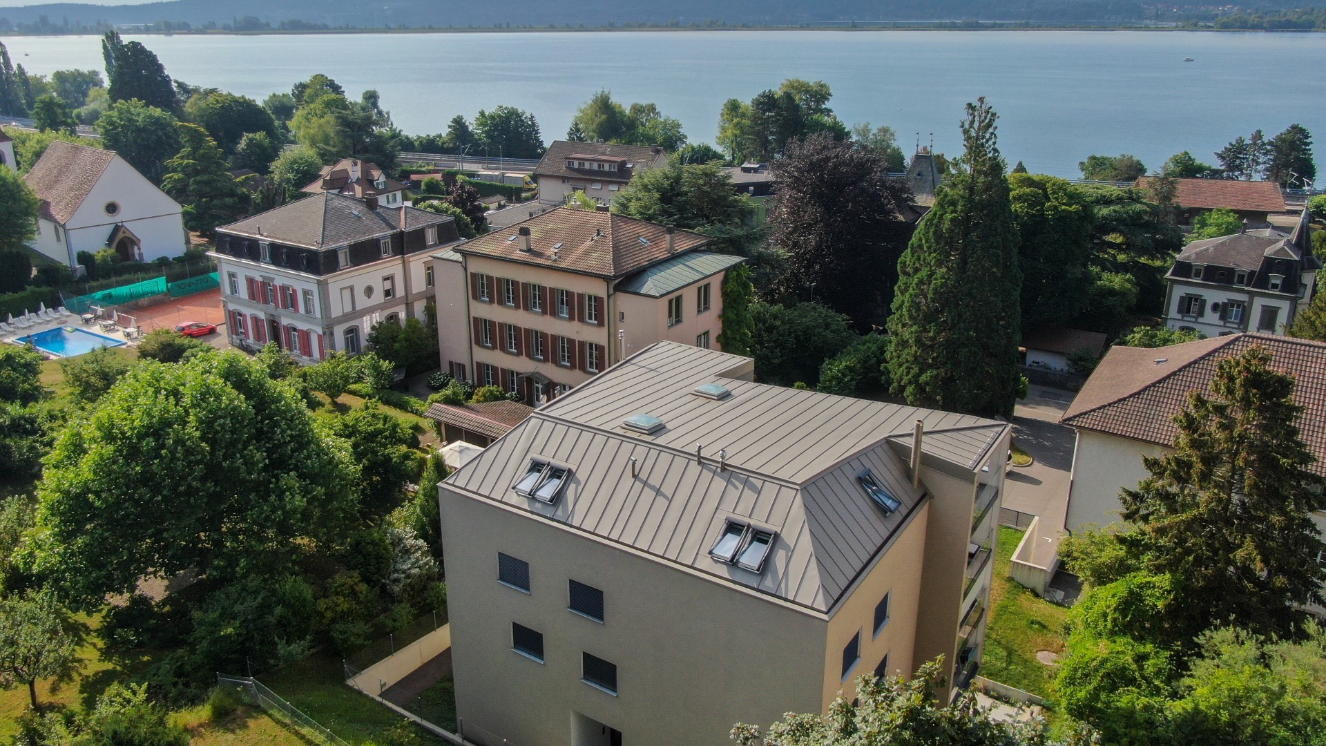 Le fractionnement optimal de la propriété en trois bien-fonds distincts fut la première étape de l’intervention de Realitim. Une fois ces aspects fonciers résolus à la satisfaction de toutes les parties, la deuxième étape consistait à mener à bien la vente de l’immeuble de rendement. Enfin, le projet de développement consistait à développer un bâtiment s’intégrant de manière optimale dans le site, alliant le respect des valeurs patrimoniales et environnementales, tout en atteignant les exigences qualitatives et de durabilité les plus ambitieuses propres à un immeuble résidentiel destiné à la vente en PPE de bon standing. Le programme consiste en dix appartements PPE de grande qualité orientés sur le lac et le bourg, et d’un parking souterrain abritant non seulement les besoins de la PPE, mais également quelques places restant en mains du propriétaire vendeur, désormais voisin. L’architecture résolument contemporaine du nouveau bâtiment conçu par le bureau d’architectes Bauart complète ainsi un ensemble harmonieux assurant un cadre de vie idyllique pour les habitants dont bénéficient autant les habitants historiques que les nouveaux propriétaires des 10 lots PPE.