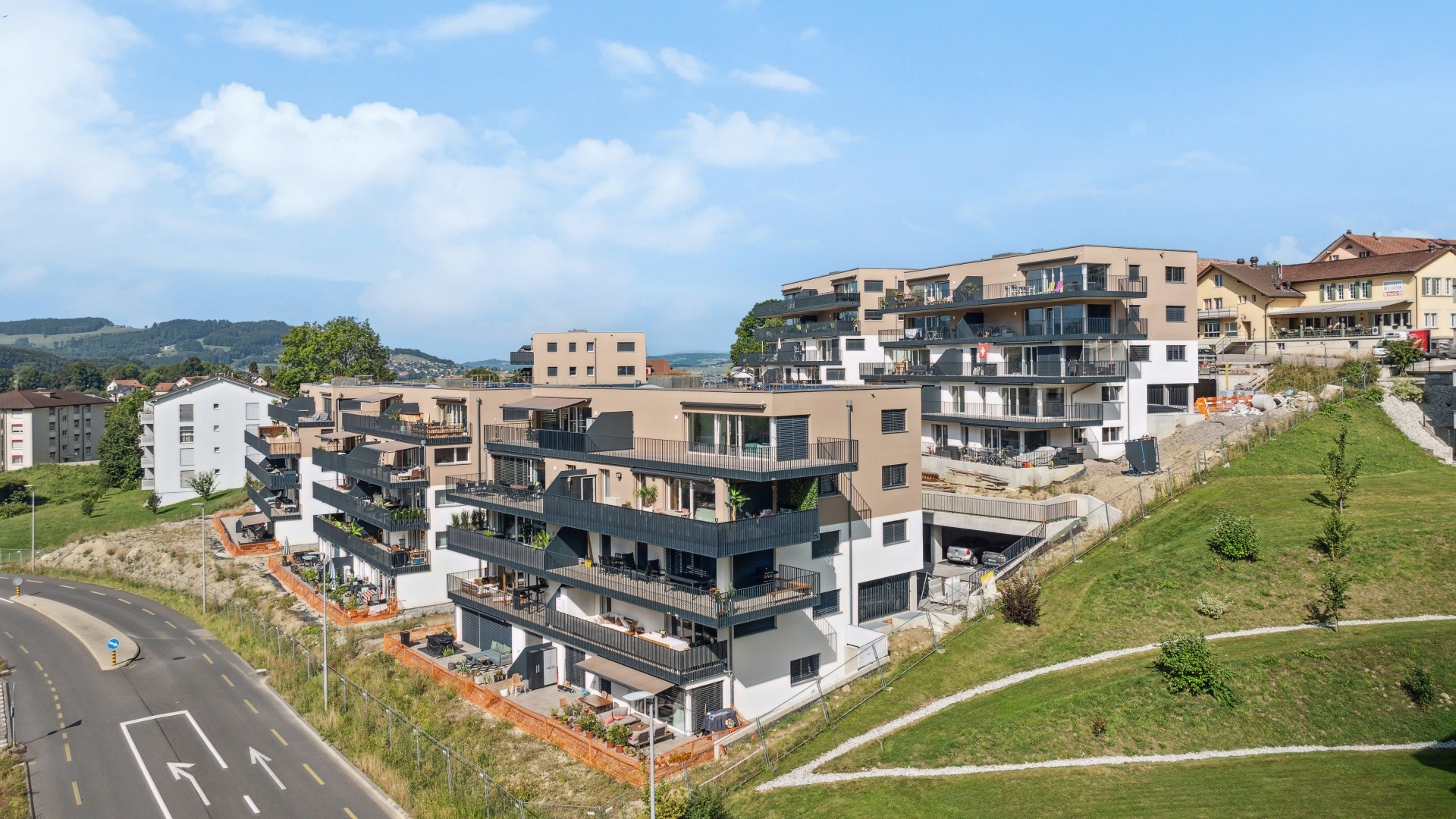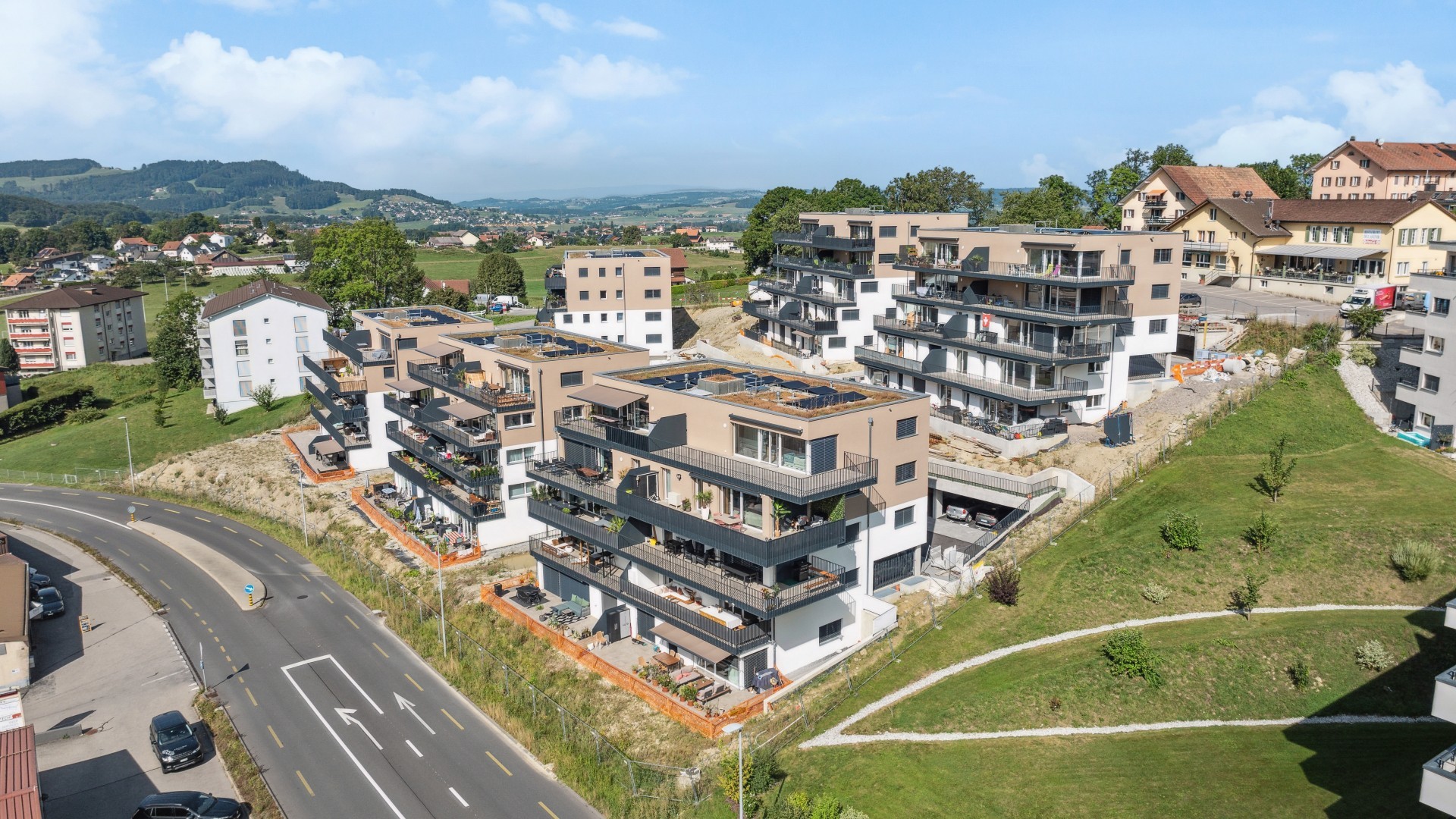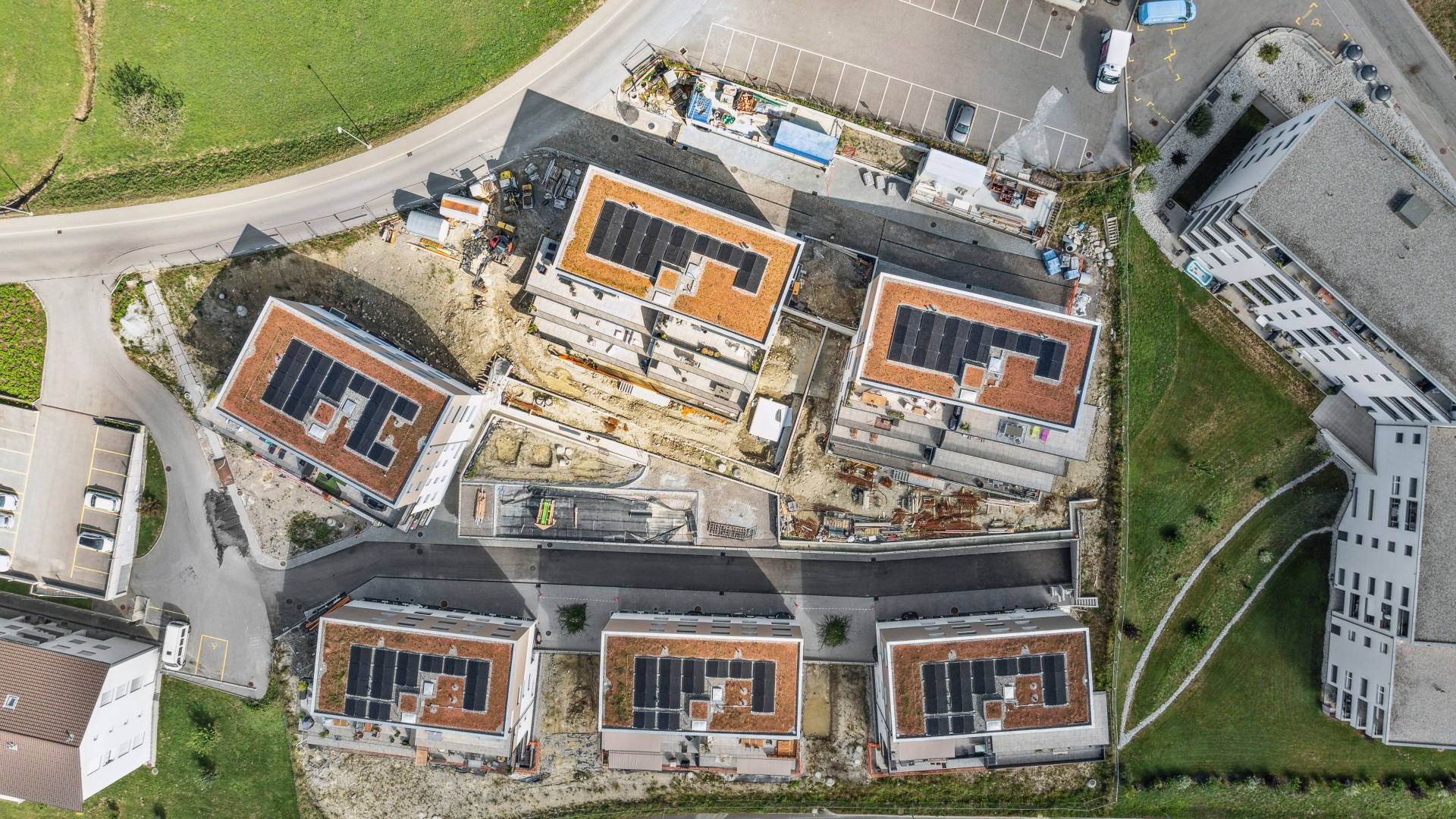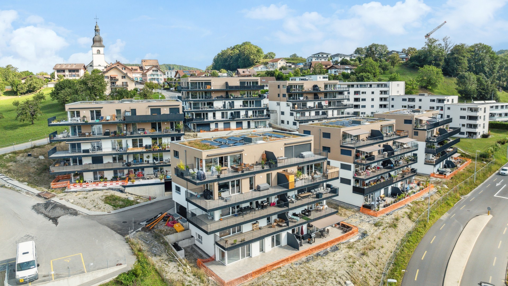 Les six immeubles de dix appartements chacun sont harmonieusement implantés dans la pente, autour d’un espace central dévolu à une grande place de jeux commune qui constitue le cœur du nouveau quartier. Les deux routes d’accès desservent les bâtiments et les 76 places de parc réparties dans des couverts intégrés aux volumes des bâtiments ou au terrain naturel. Les appartements, organisés dans l’esprit d’une architecture en « terrasses », bénéficient tous de grands balcons exposés au Sud. Le projet est labélisé CECB A/A, avec une production de chaleur par pompes à chaleur air-eau.